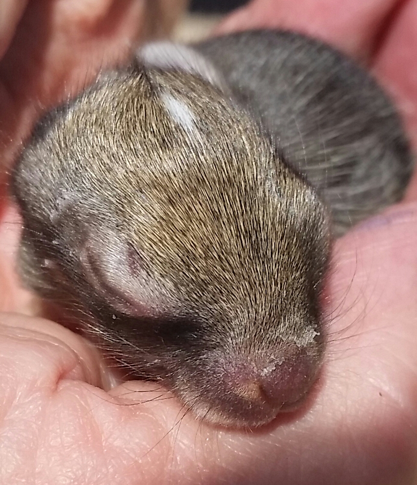 A cat raided a rabbit’s nest. Hopefully this 9 day old cottontail, with eyes still closed,