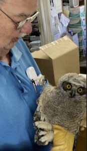 High winds brought this young Great Horned Owl to the ground. Now at DVWR, the youngster will receive proper nutrients. After developing needed hunting skills the Great Horned Owl will be released.